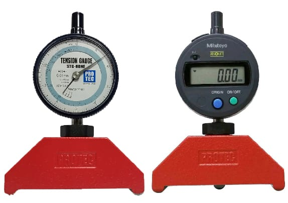 在网版上施予ㄧ定的重量/下压力,所产生的微小位移量/刻度值,透过数位式仪器将位移量进行精密检测,读取网版张力测定值。