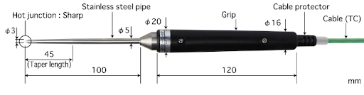 这款温度传感器具有针状,可刺入被测物体以测量温度。[特点] - 针尖内部熔接有高温触点。
