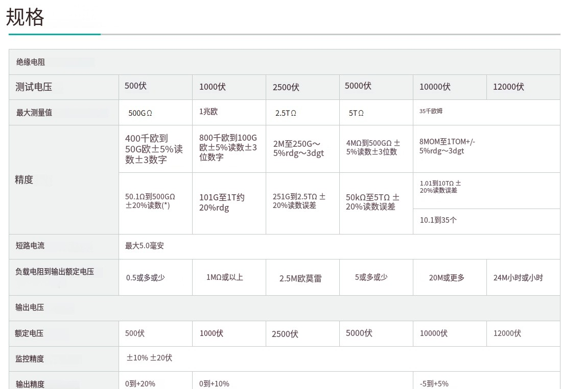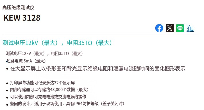 产品简介: 测试电压12kV(最大),电阻35TQ(最大) 测试电压12kV(最大),电阻35TQ(最大) 短路电流5mA(最大) ·在大显示屏上以条形图和背光显示绝缘电阻和泄漏电流随时间的变化图形表示